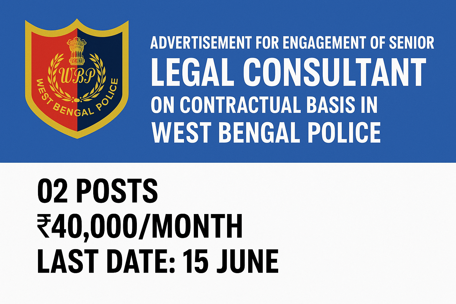 👨⚖️ Senior Legal Consultant Recruitment West Bengal Police 2025 – Apply Offline or Email Before 15 June The West Bengal Police Department has released an official advertisement for the engagement of Senior Legal Consultants on a contractual basis. A total of two (02) posts are available. The appointment is for highly experienced legal professionals who … Read more